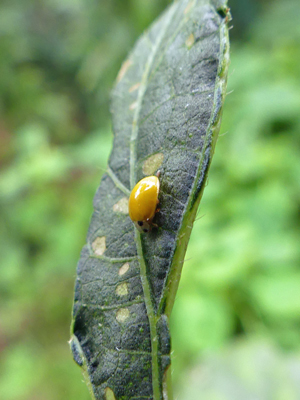 キイロテントウが居ました。弱って傷んだオクラの葉にとまっていました。このオクラはうどんこ病にやられていて、このテントウムシはその菌を食べる種類なので来ていたのだと思います。(2021/10/12 記)