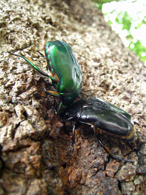 8月に入るとカブトムシもだいぶ少なくなりました。昼間によく来ているカナブンに、クロカナブンが混じって来るようになりました。場所取りでカナブンの緑色タイプのものと押しくらまんじゅうをしていました。