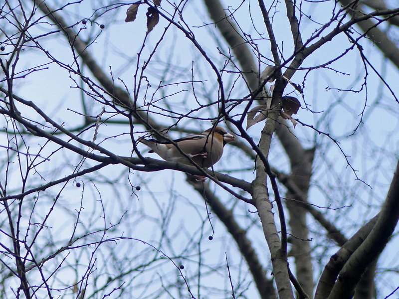 | シメ 群で来ていますが、こちらも木の上ばかりに居て降りてきてくれません。木に成っている実を食べ尽くした後に降りてくるのでしょうか? |