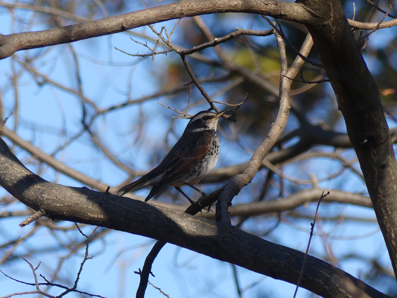 | ツグミ まだ地面にあまり降りてきてくれず、木の上の方にとまっているものが多かったです。数も多くないように思いました。 |