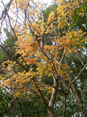 | 年を越しましたが、まだ紅葉が残っていました。常緑樹と混じっているのが、いかにも暖地の低山という雰囲気でした。 | ||