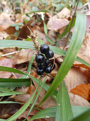 ヤブラン キチジョウソウとは別のところで黒い実(実に見えますが種だそうです)をつけていました。ジャノヒゲがあれば青い実を見ることができると思い探したのですが、見つけられませんでした。 |