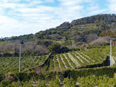 麓の辺りです。海からの風を防ぐように生け垣でみかん畑を囲んでいるのではないかと思いました。