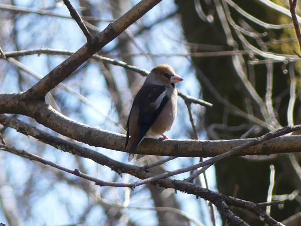 | シメ 一羽、雌を見つけました。残念ながら逆光になってしまいました。 |