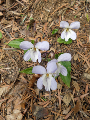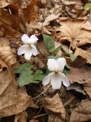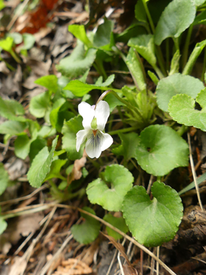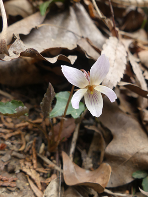 | ほとんど純白のものもありました。 | 花の色はヒナスミレに近いですが全体の雰囲気はナガバノスミレサイシンに似ています。雑種でしょうか。 | |