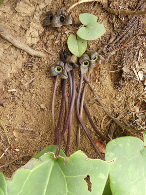 | カンアオイ 大きな株が斜面に出ており、花の様子がよく見えました。 |