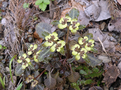 | ヤマネコノメソウ 終わっているものも多かったですが、まだ咲いている株を見つけることができました。 |