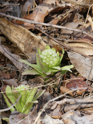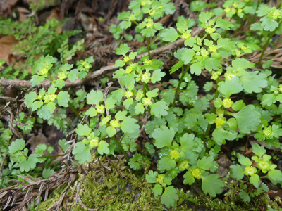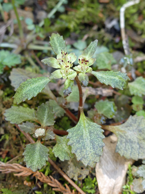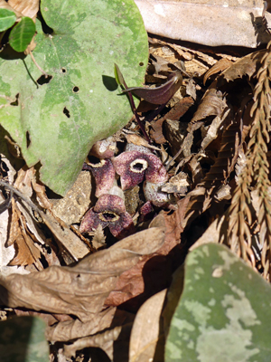 | ニッコウネコノメと思われるネコノメソウがありました。ヨゴレネコノメは見当たりませんでした。 | カンアオイ 雲状紋が綺麗な株に花が沢山咲いていました。 |