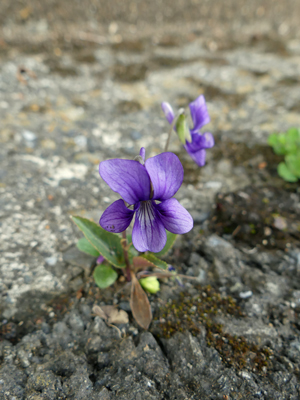 | ヒメスミレ 葉に艶があり厚かったのでヒメスミレだと思いました。 舗装道の割れ目に出ていました。 |