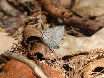 ![]() 翅の付け根が黒っぽくて鱗粉が大きいので、たぶんスギタニルリシジミだとおもいます。 |