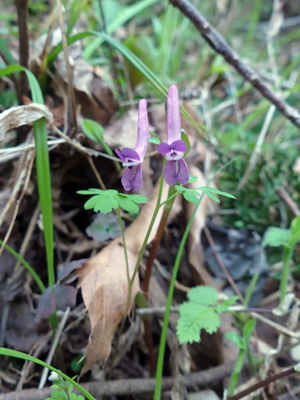 | ジロボウエンゴサク だいぶ降りた所で見つけました。もう薄暗くなっており、三脚を立てて撮りました。 |