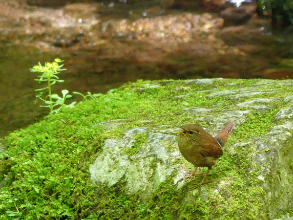 | ミソサザイが沢の中の石の上でずっとさえずっていました。 | ||