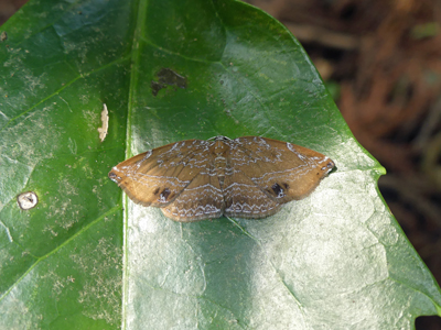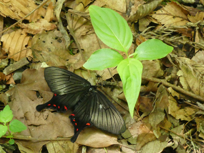 アゲハモドキ 久し振りに見ました。蝶に見える蛾です。クロアゲハよりずっと小さいです。翅が傷んでいますが、少し弱っているようでした。 |