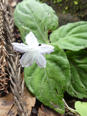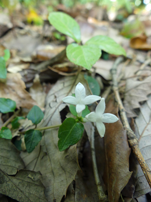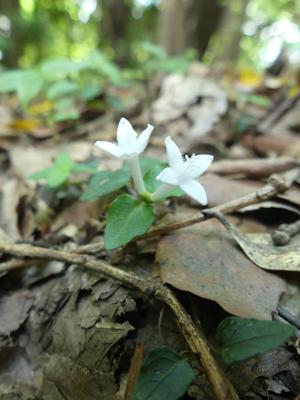 | ツルアリドオシ 2箇所で群落を作っていました。花の後にに2つの跡がある赤い実が成りますが、右側の写真の花の付け根が膨らむと実になるのだろうと思いました。 |