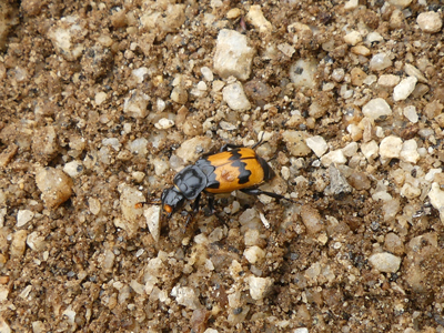 ヒロオビモンシデムシ 飛びかけたところを手で遮って撮ったものです。この後直ぐに飛ばれました。左翅にはシデムシ類によく着いているダニが居ます。 |