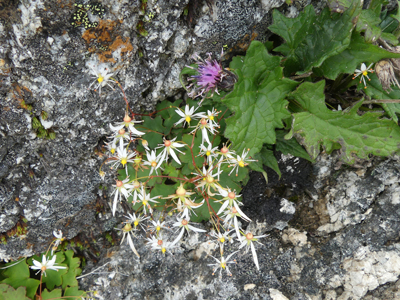 ![]() ミヤマダイモンジソウ 生えているのが山頂のすぐ近くで咲いていました。毛が少ないのでダイモンジソウと思います。横で咲いているのは総苞が黒いのでシラネヒゴタイと思います。 |