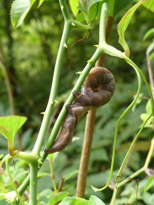 | サルトリイバラに背中に眼状紋がある大きなイモムシがとまっていました。調べてみたところオオトモエの幼虫のようでした。 | ||