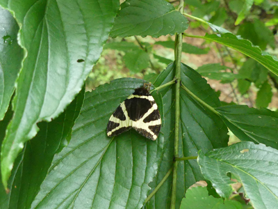 ![]() あまり見かけない模様の蛾が葉にとまって休んでいました。調べてみたところシロオビドクガの雌でした。ドクガの仲間ですが毒はないそうです。 |