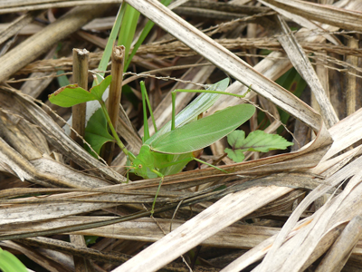 ![]() 前胸背板の後縁に薄いながらも帯があるように思えたのでヘリグロツユムシの雌のような気がしますが、合っているでしょうか。 |