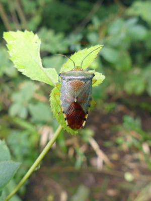 | セアカツノカメムシの雌が葉にとまって休んでいました。 | ||