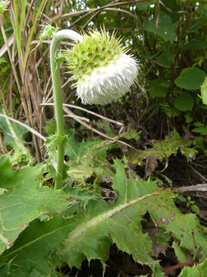 | シロバナフジアザミ もう終わり掛けでしたが綺麗に咲いているものも探せばありました。鹿の食害がひどくて葉や花が食べられていました。 |