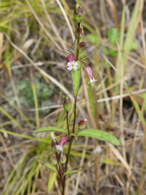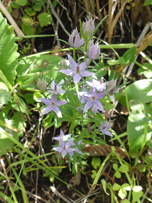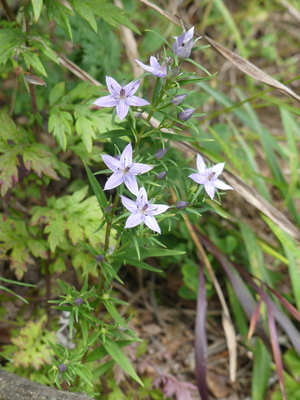 ムラサキセンブリ ほぼ見頃でした。左上の写真は花は少ないですが様子がよくわかります。右上はもう少し花が多いもの、左の写真の株は今回見たなかで一番花付きが良かったものです。 |