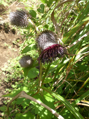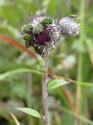 オヤマボクチ 今回は少ししか花を見なかったです。左の蕾にはコアオハナムグリ?が多数もぐりこんでいました。 |