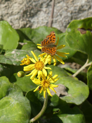 | ツワブキ ちょうど見頃でした。右の写真にあるようにキタテハも来ていました。 |