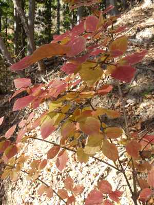 ![]() ここから紅葉の写真です。これはバイカツツジの紅葉と思います。まだ緑色の葉のものもありました。 |