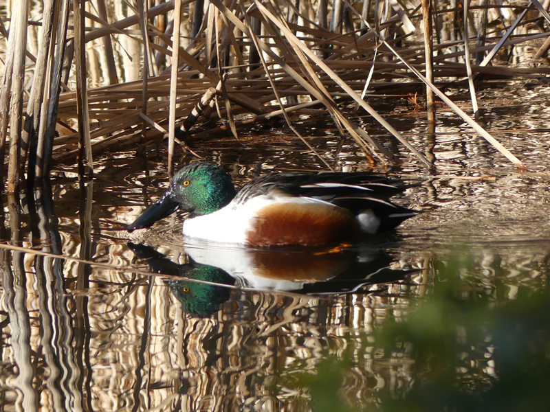 | ハシビロガモ 2羽の雄がずっと一緒に居ましたが、一緒に居るところはうまく撮れませんでした。 |