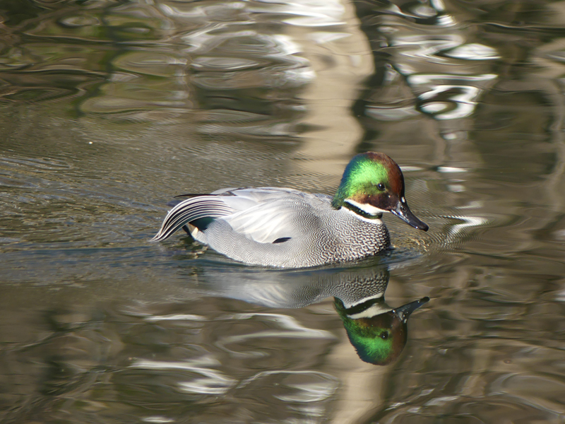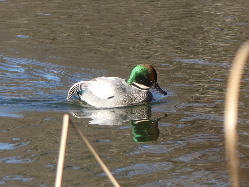 | ヨシガモ オカヨシガモの近くに雄が一羽居ました。頭の色は構造色なので、光の当たり具合で変わって見えます。 |