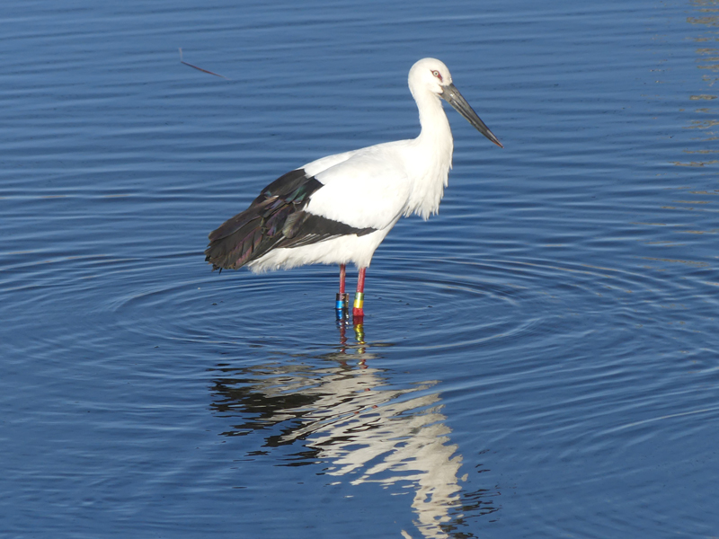 | コウノトリ 2羽が餌を探して池の中を歩いていました。ダイサギが近くに居ましたがずっと大きいです。 |