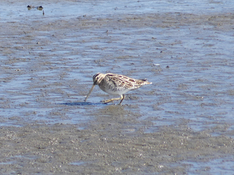 | タシギ 沼は水量が少なくなっていて干上がった所も多かったです。干潟状になったところで、数羽の群が餌を探していました。動きが速かったので、一羽だけいるところしか撮れませんでした。 |