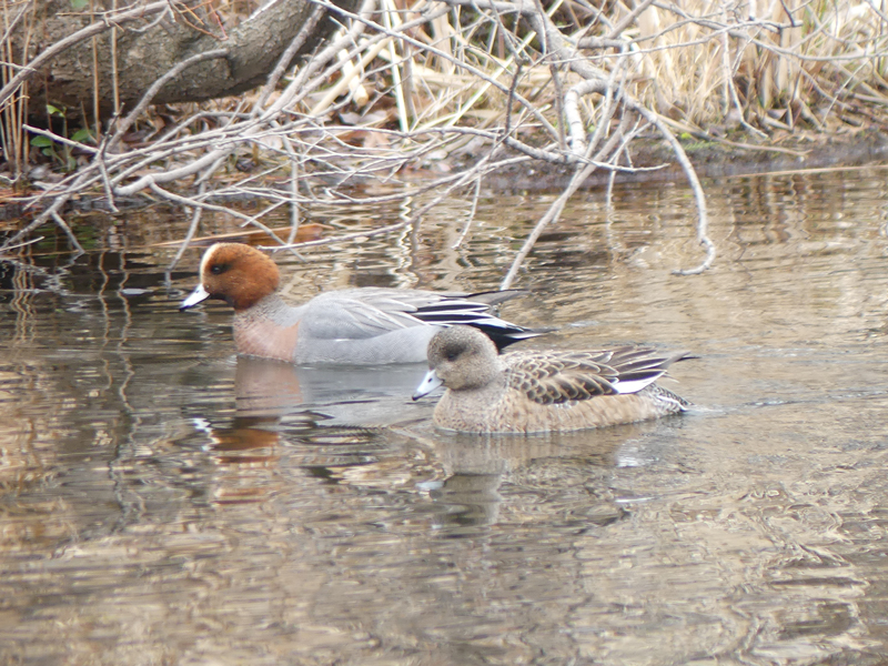| ヒドリガモ 雄雌2羽が並んで泳いでいますが、ずっと一緒にいる訳ではなくたまたま近くにいただけという感じでした。 |