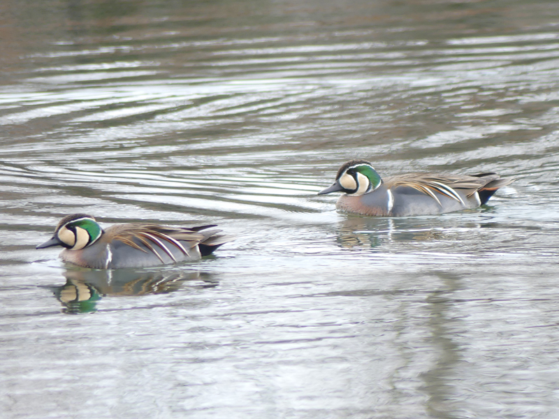 | トモエガモ 2羽の雄が並んで泳いでいました。 |
