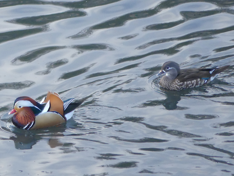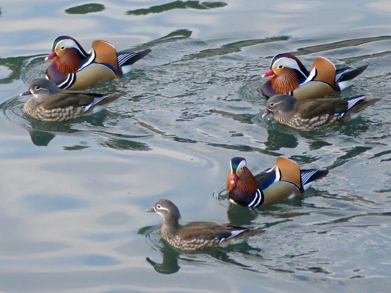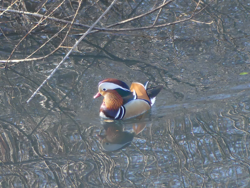 | オシドリ 池に張り出した木の陰に群が居るようでしたが、なかなか出てきてくれませんでした。時間が遅くなるにつれ、出たり入ったりするようになりました。 |