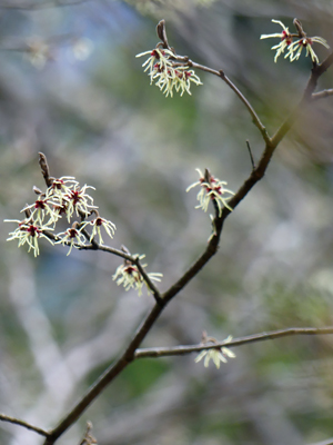 | マンサク 2か所で花を見ました。登山道のかなり下に生えている木の高枝が登山道から見ると水平に近い位置で見えており、花が咲いている様子が良く見えました。 |