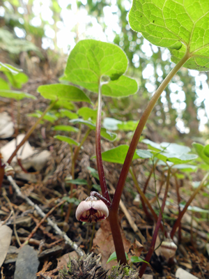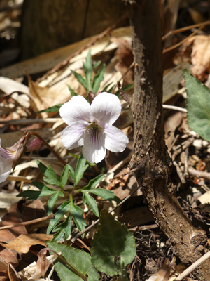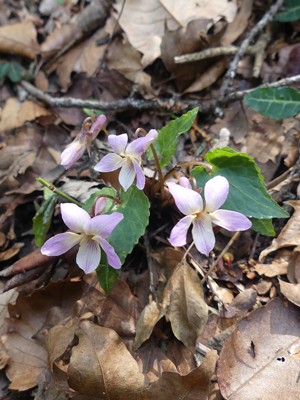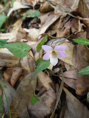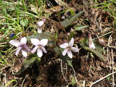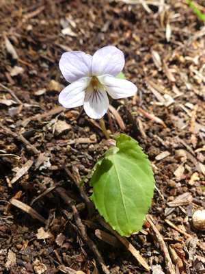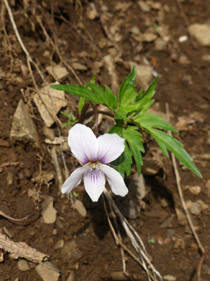ヒカゲスミレ 何ヶ所かで咲き始めていましたが、まだ蕾のものも多かったです。花の色は赤紫がかったものと下の写真のように白っぽいものと両方ありました。これまでは下の写真のような花の色のもののほうを見たことが多かったように思いました。 |