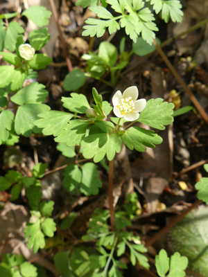 キクザキイチゲ 毎年見ている場所で今年も変わらず咲いていましたが、花をつけた株は2つしか見当たりませんでした。 |