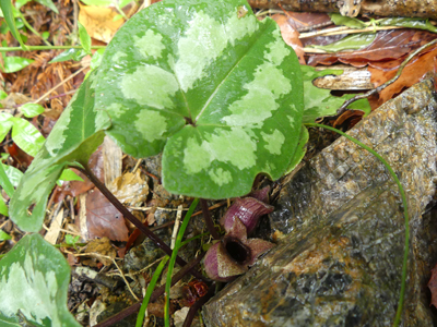 ![]() カンアオイの仲間が咲いていました。関東地方のものと葉も花も違うように思いますが、種類はよくわかりませんでした。 |