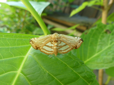 この蛾は種類を調べたのですがよくわかりませんでした。民家のアジサイ(だったと思います)にとまっていました。 | |