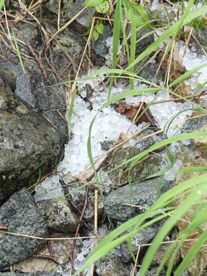 涸沢ヒュッテに向けて登りはじめると猛烈な雨となり、途中から雹が降ってきました。イクラくらいの大きさの粒で痛かったです。 | |