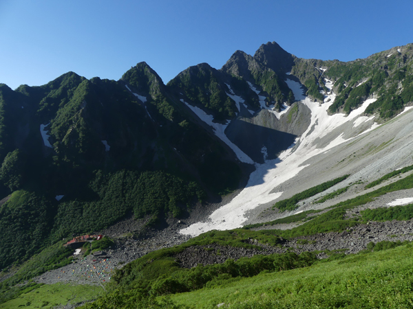 | 登山の途中に撮った景色です。左下に涸沢ヒュッテが小さく見えます。 | ||