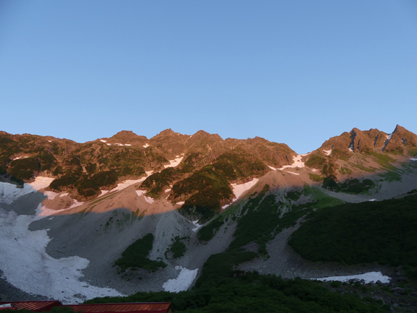 | 涸沢ヒュッテからの早朝の景色です。前日と異なりよく晴れましたが、午後は天気は悪くなるという予報でした。 | ||