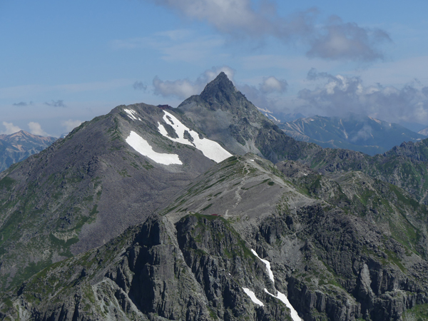 | 北穂高小屋からみた槍ヶ岳です。少し雲が出始めていたので、あまりゆっくりせずに出発しました。 | ||