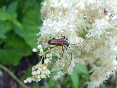 ![]() 綺麗な色のカミキリムシがオニシモツケに来ていました。カラカネハナカミキリだと思います。 |