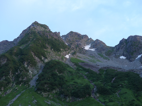 | 涸沢ヒュッテに無事戻り、翌朝に北穂高方面を撮った写真です。奥正面に小さく北穂高小屋が見えています。 | ||