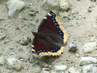 キベリタテハ 何回か見かけましたが飛ばれてしまっていました。最後に吸水している所を見つけたので、そっと近づいて撮りました。 |