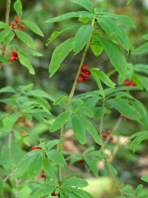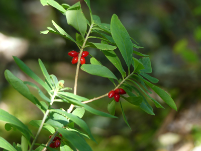 ![]() チョウセンナニワズ オニシバリによく似た木が赤い実をつけていました。落葉していないので調べてみたらばチョウセンナニワズのようでした。 |