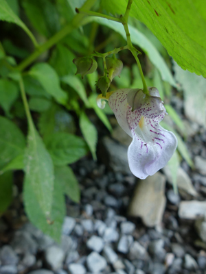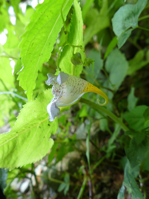 | ハガクレツリフネ 関東地方には無いので、今回見たかった植物です。 葉の下に隠れるように花が咲きます。 |